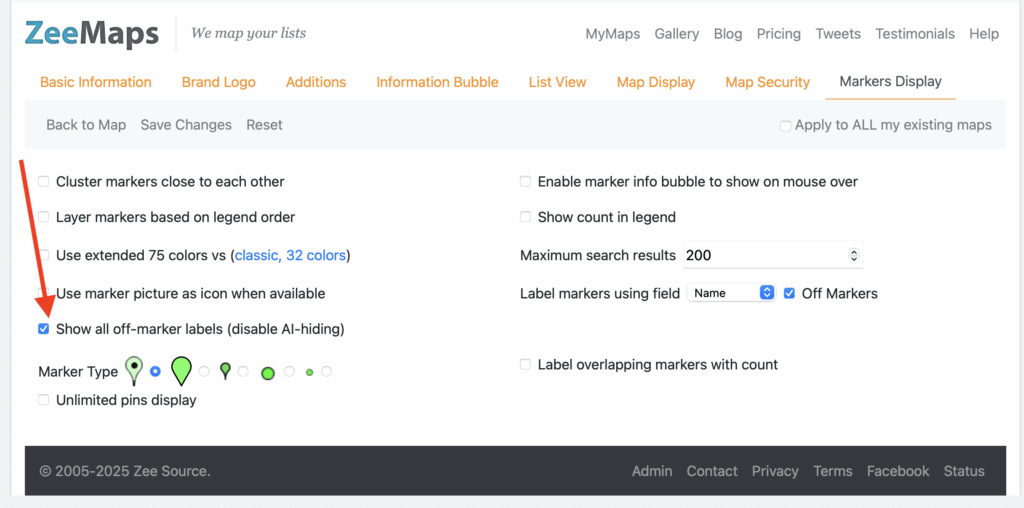 Sometimes you may want all your labels to show, even if the display is slightly cluttered. You can use the Map -> Settings menu, and then the Markers Display tab to change the setting for “Show all off-marker labels (disable AI-hiding)”: